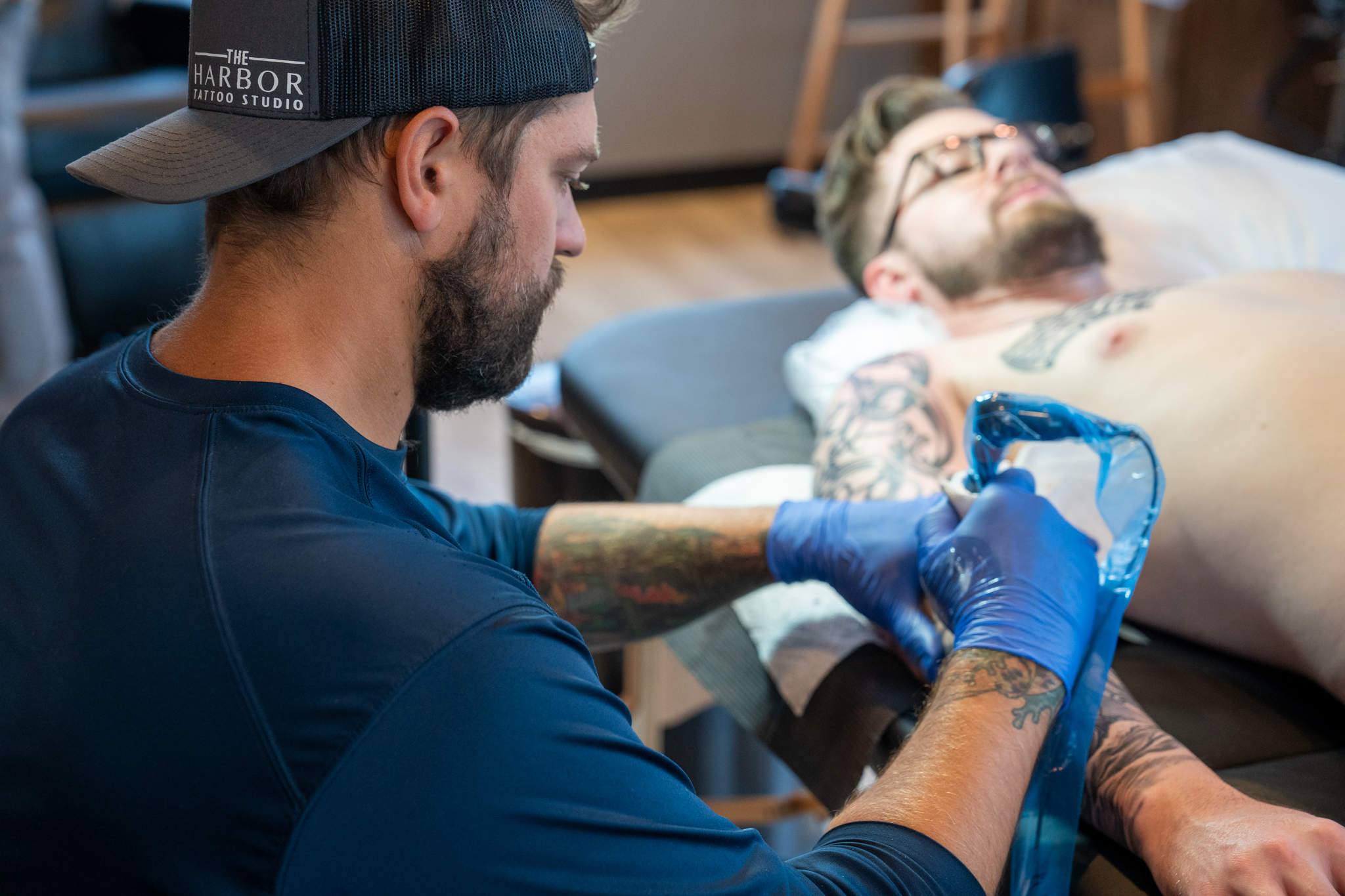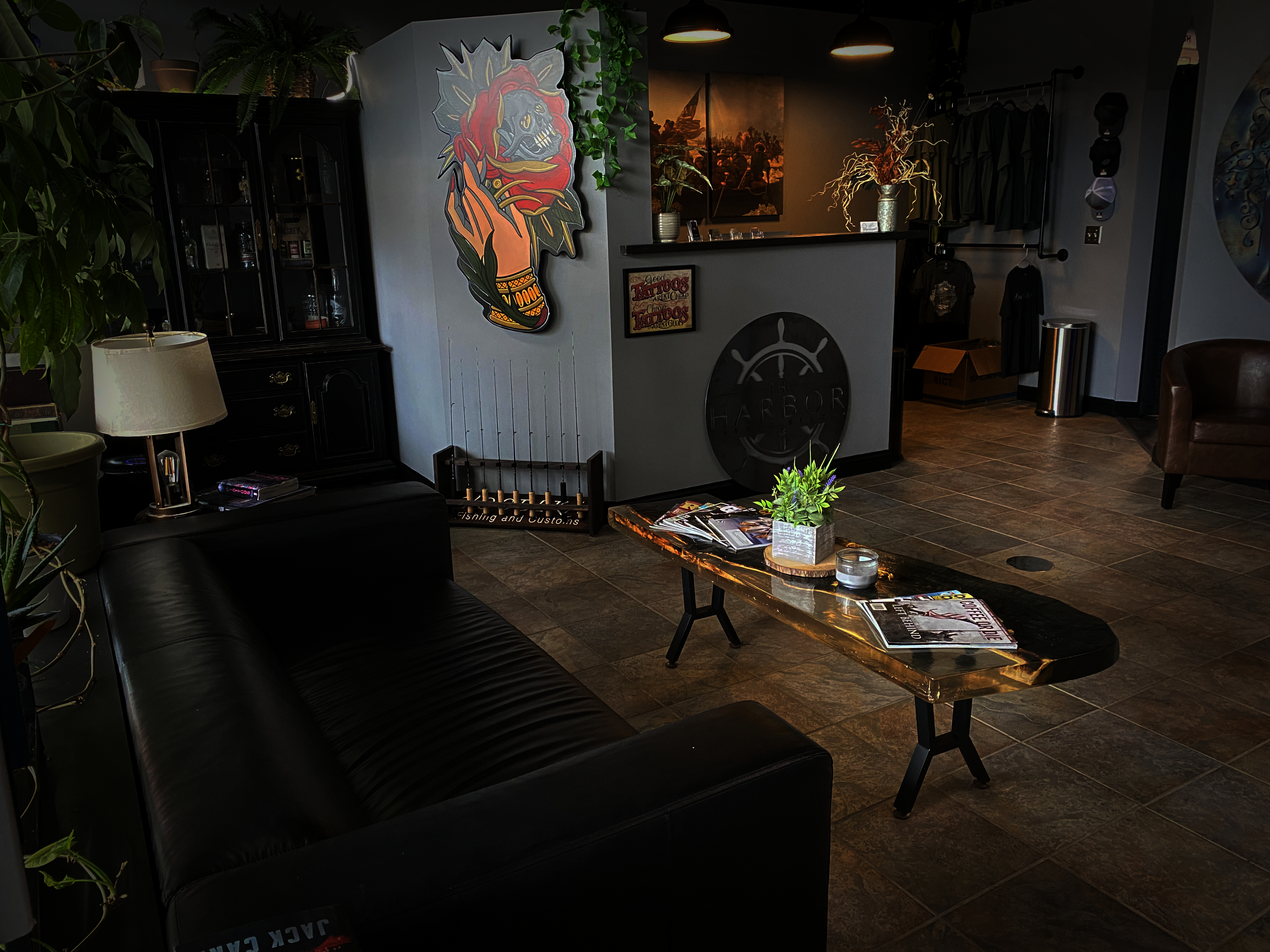 The Harbor Tattoo Studio is not what you think of for your average tattoo parlor. Our bright, clean, and modern space is in beautiful downtown Mound, MN, just steps away from Lake Minnetonka. It might be the only place you can get a tattoo and walk away with a custom VF Rod.